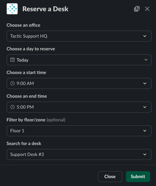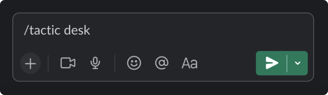 You can easily reserve a desk without ever leaving Slack using Tactic’s Slack integration. Follow the steps below to get started.