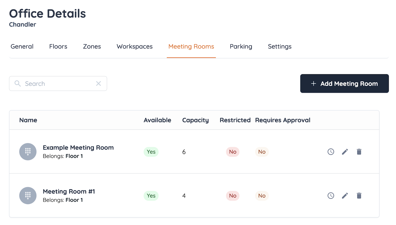 - For each building, you will need to click on the edit pencil and navigate to the Meeting Rooms tab and click the pencil icon for the meeting room you are wanting to link.